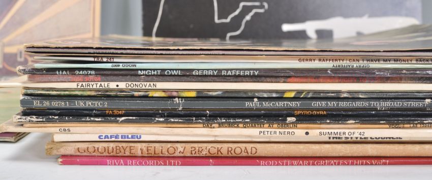 A collection of Vinyl long play LP records to include  Rod Stewart ( various ) , Python Lee Jackson, The Style Council, Peter Nero, SpyroGyra, Paul McCartney, Donovan Fairytale, Gerry Rafferty,  ( various ), Elton John & Others