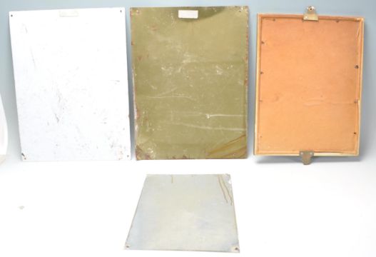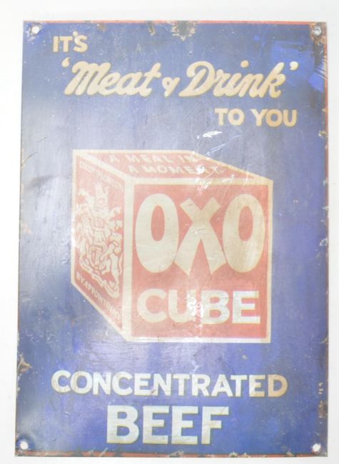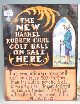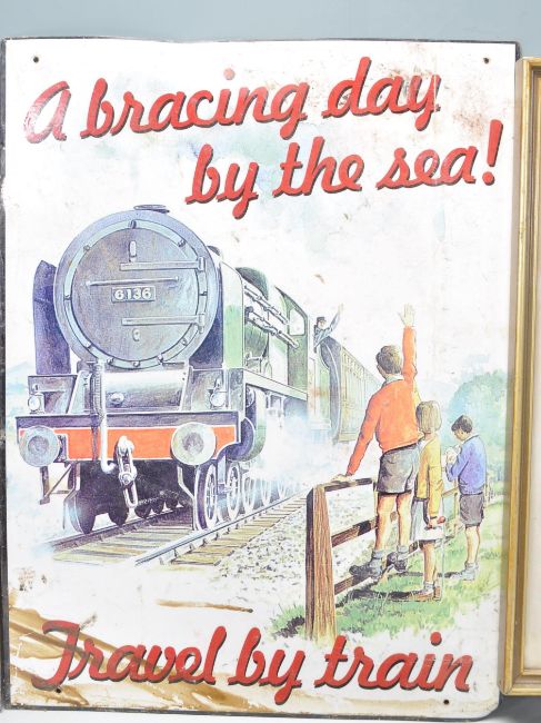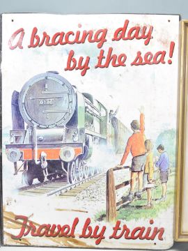 A collection of vintage style signage to include The New Haskel Rubber Golf Ball, Travel By Train - A Bracing day be the sea, Oxo Cubes and another