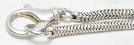 A good, large silver 925 langard chain of snake link form uniting with a large lobster clasp. Total length 128cms long / weight 104.33g.