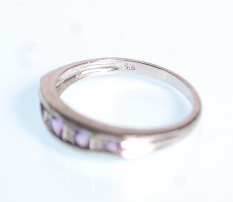A hallmarked 9ct white gold ladies dress ring set with a central round cut light blue stone. Hallmarked for Birmingham date letter C, ring size R. Together with a another 9ct white gold ring set with five graduating purple stones with diamond stone spacers. Ring size Q. Total weight 5.0g.