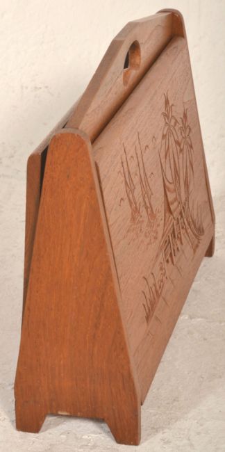 A mid century Chinese camphor wood  / hardwood folding magazine rack stand with carved detailing to the centre. The folding panels having inset carry handle top to centre. Measures 36cm tall by 46cm wide and 12cm deep.