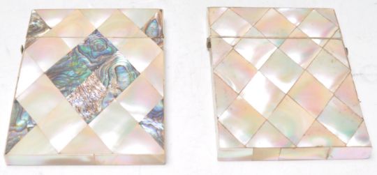 Two 19th Century mother of pearl card cases of rectangular form with both having push button catches to the hinged covers. One having Abalone shell decoration. Both measures 10cm long by 8cm wide.