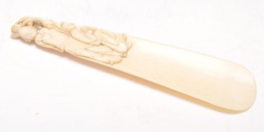 A 19th Century Chinese ivory shoe horn having a handle carved with a figure of a woman and child with pomegranates to the top. Measures 12 cm high.