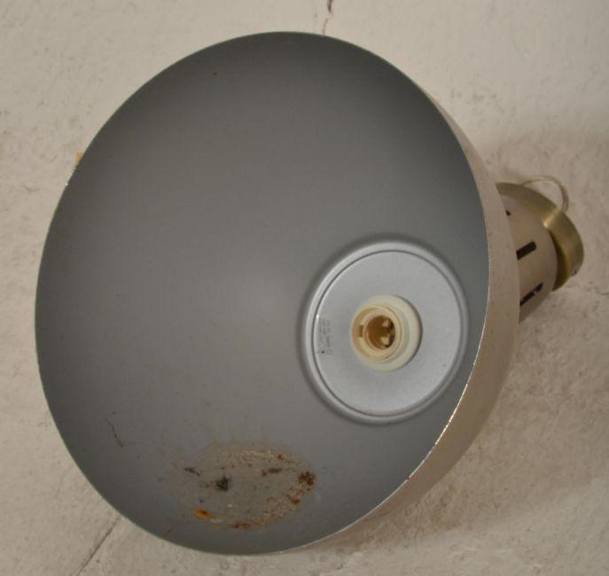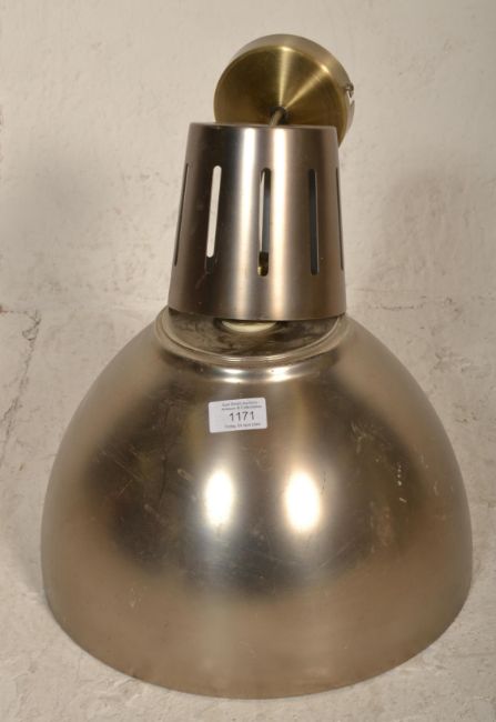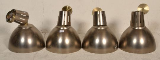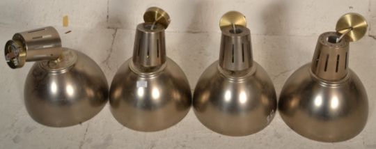 A set of 4 contemporary factory / Industrial style brushed gold aluminium pendant lights each with half moon spherical shades complete with ceiling mounts to each. Measures 47cm tall by 33cm diameter.