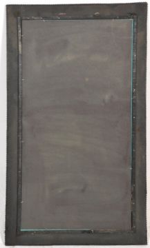 An unusual Moorish - Moroccan wall mirror having a stained camel bone inlaid cushion border with silvered metal border having a central mihrab niche and mirror glass. Measures 125 cm x 70 cm.