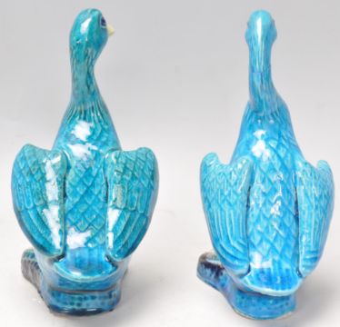 Two mid 20th Century Chinese ceramic duck figurines having a turquoise glaze, raised on naturalistic bases glazed in an aubergine glaze. Some repairs. Measure: 16cm high.