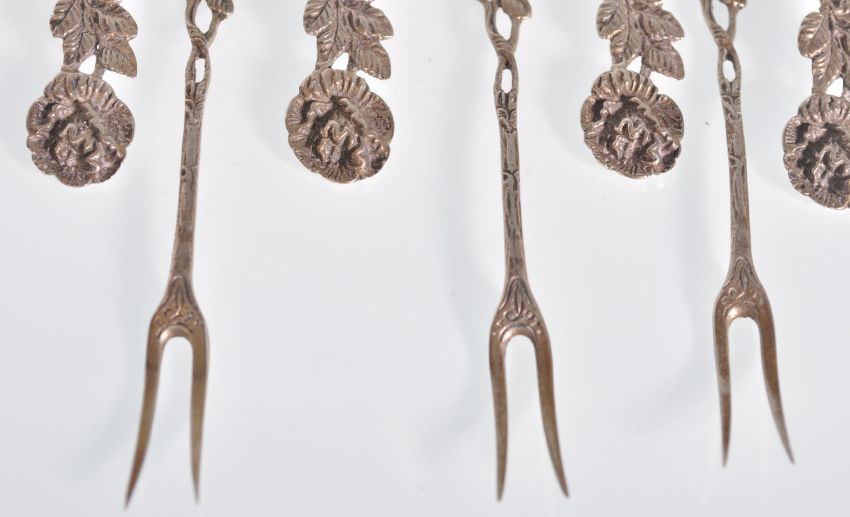 A set of six vintage continental silver coffee spoons having moulded rose head handles with engraved detailing. Together with a matching set of six forks. All stamped to verso 835. Total weight 85.6g. Spoons measure 10cm long.