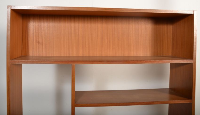 A mid century teak wood veneer Stateroom room divider bookcase / upright cabinet. Raised on shaped legs with a series of drawers and cupboard with shelves atop. Makers label inside door. Measures 177 x 107 x 27cm.