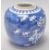 A late 19th / early 20th Century Chinese ginger jar of bulbous form being hand painted in blue an white in the prunus pattern with geometric borders to the rim. Blue circle mark to the base. Measures 13 cm high.