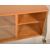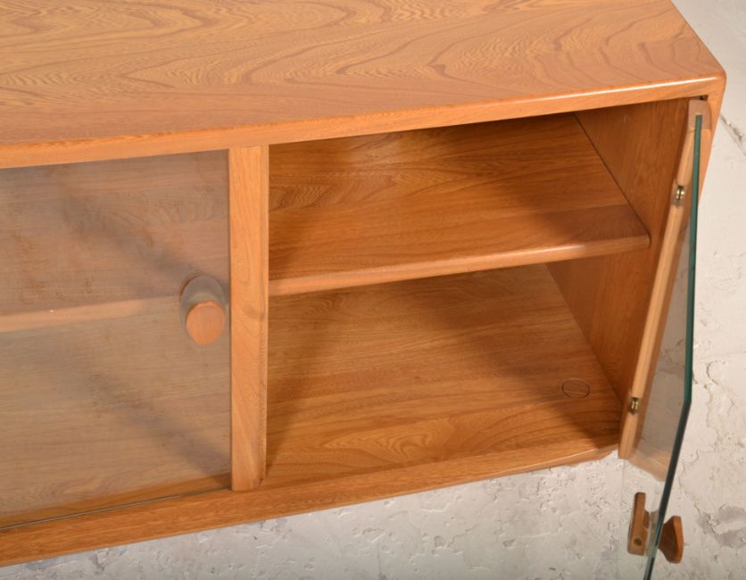A good Ercol TV display unit stand of rectangular form having twin glazed doors with shaped wooden handles and shelf within. Raised on castors. Measures 55 cm high  x  91 cm wide  x  43 cm deep.