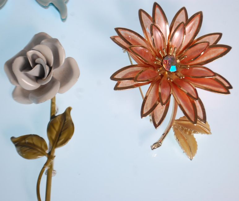 A collection of six vintage mid 20th Century brooches to include a blue enamelled flower brooch set with marcasites, a pink flower brooch set with pearls, a yellow rose brooch set with rhinestones, a ceramic butterfly brooch etc.