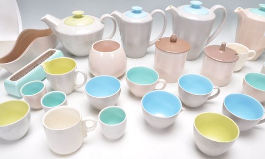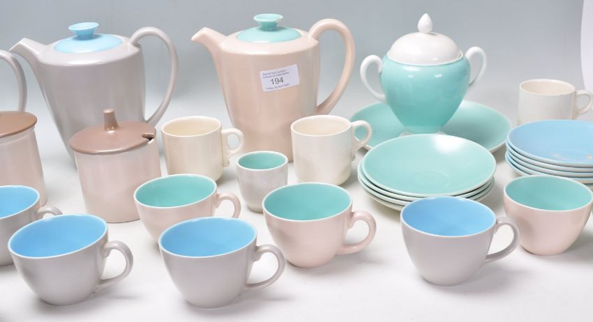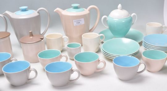 A collection of vintage Poole pottery to include coffee pots, tea pot, cups and saucers, sugar bowls etc. All having cream exteriors with coloured interiors. Marked Poole pottery to the bases.