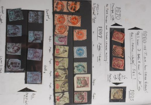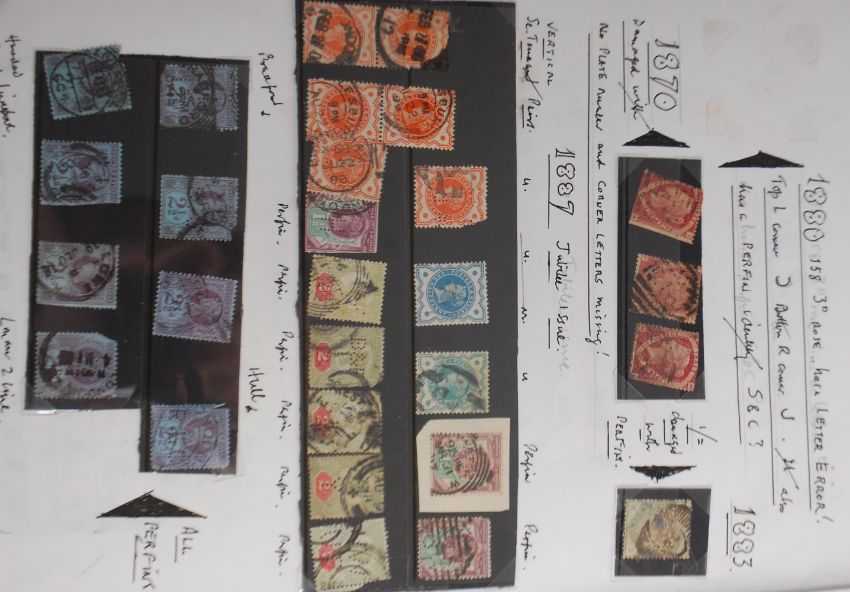 A collection of interesting stamps to include Victorian penny reds with examples from 1870 having no plate number, corner letters missing, a collection of 2 1/2d perfins stamps. Victorian penny reds on covers with names for John Lloyd Solicitor Ludlow having postage and attached office stamps. Also 1887 Silver Jubilee perfins stamps 3d and others with paddington office stamps, 6d perfins stamps, various other stamps with perfins etc.