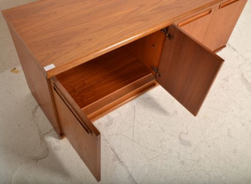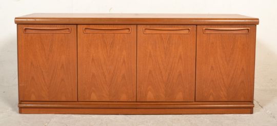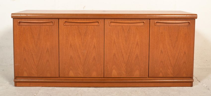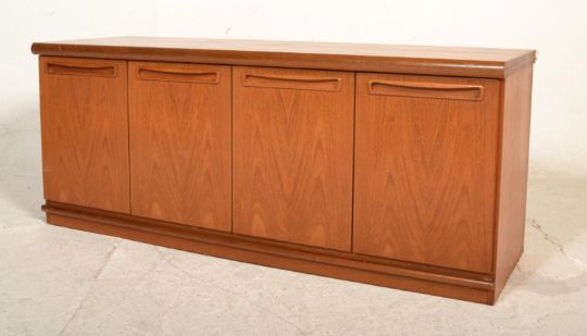 A retro mid 20th Century G Plan low teak wood sideboard credenza having a configuration of two twin door cupboards, each door having recessed handles. Raised on a plinth base. Measures 56cm tall by 135cm wide and 45cm deep.