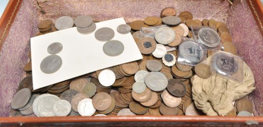 A large collection of mostly GB English coinage dating from the 19th Century to include 16x Great Britain coin books to include Half Crowns, Sixpence, Shillings, Florins, Pennies etc. Together with a suitcase of loose copper and other coins, some world example, a 1970 Northern Ireland coin set and more.