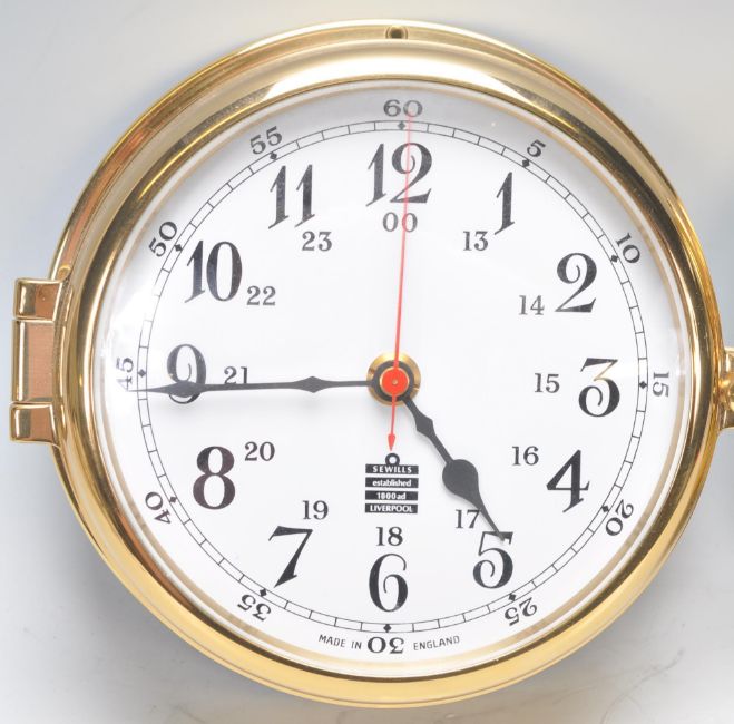A contemporary bulkhead brass cased Precision Aneroid Barometer by Sewills of Liverpool together with a matching clock. Together with a brass cased Forbes Weathermaster Barometer. Biggest measures 18cm diameter by 7cm deep.