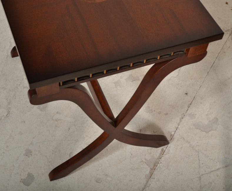 Theseira - A reproduction mahogany nest of graduating tables having carved frieze with flared tops above. Raised on X frame supports with inlaid decoration. Label to underside for Theseira.  Measures 51cm tall by 58cm wide and 41cm deep.
