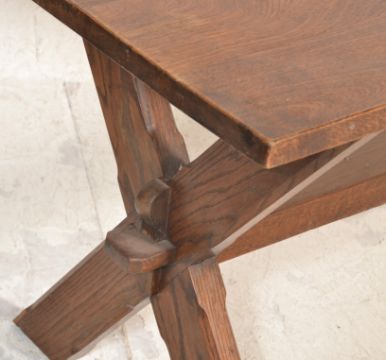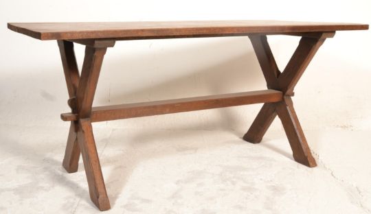 A good early 20th century Arts & Crafts gorthic solid oak and elm refectory dining table in the Jacobean manner of long form. Raised on X frame supports united by lower stretchers. Above, a fitted frieze frame. Measures 76 cm high  x  168 cm wide  x  75 cm deep.