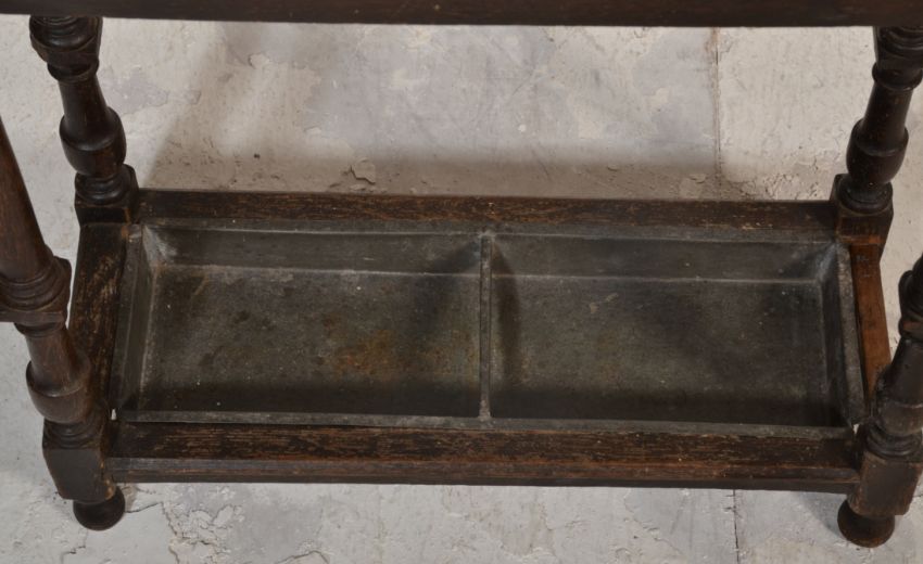 A Victorian 19th century carved oak stick / umbrella stand having twin sections with turned column supports and finial tops with drip trays to the base. Measures 60 x 35 x 21cm.