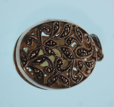 A selection of silver jewellery to include a a collar necklace of graduation greek key design, a crossover brooch set with marcasites, and a locket of oval form set with marcasites, a silver bangle with a flower panel set with marcasites and a mother of pearl panel. All marked silver. Weight 55.1g.