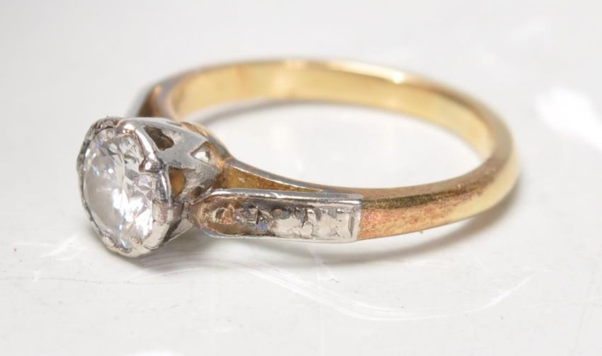 An 18ct gold and diamond single stone ring. The round cut diamond being approx ct weight 0.46cts being set in platinum basket setting. Total weight 2.10g.