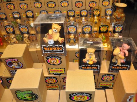 A large collection of boxed Bad Taste Bears including various models.