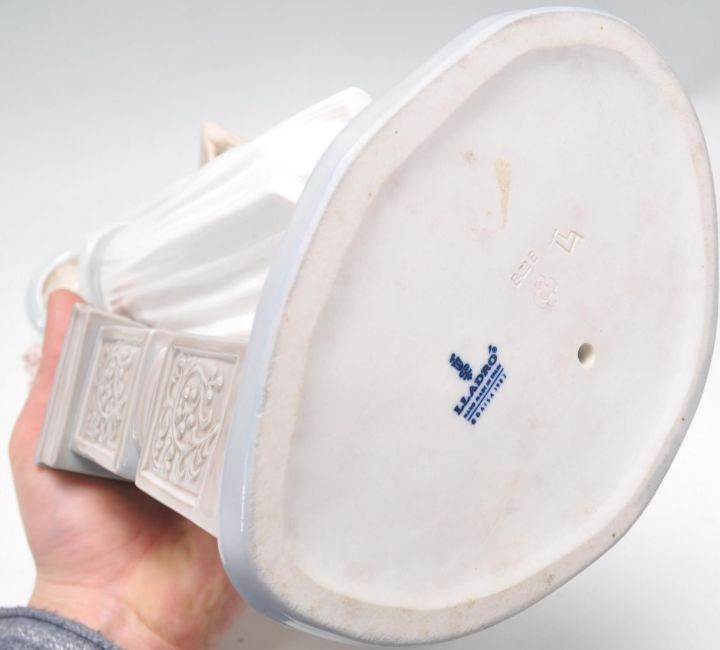 A Lladro porcelain figurine of a 1920's flapper girl modelled next to a jardiniere stand. Stamped Lladro to the base. Measures 35 cm tall.