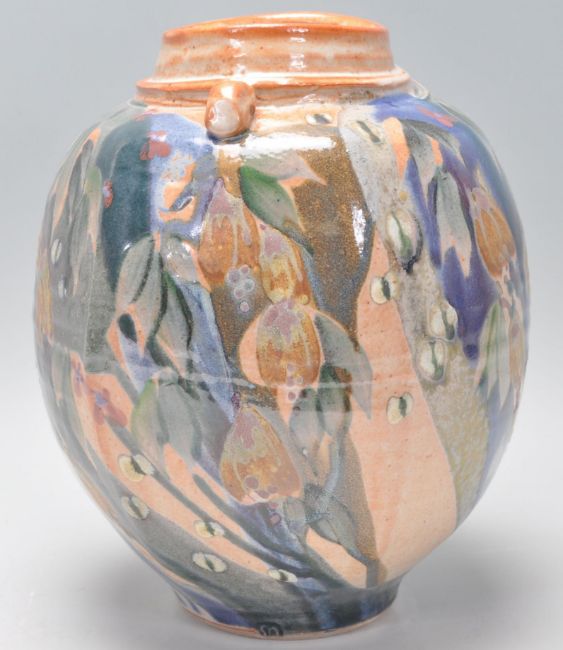 Stefanie Newton - A 20th Century studio art pottery vase of bulbous form having twin handles to the neck decorated with floral glazing, together with a similar plate of round form having incised decoration to the rim. Vase marked SN. Measures 13 cm high.