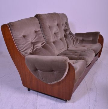 A vintage retro G-Plan 'saddle ' 3 piece sofa and armchairs suite consisting of 2 armchairs in the manner of Kofod Larsen and the matching sofa Each upholstered in the original velour fabric and raised on ball chrome castors with teak frames. Measures 85cm high  x  175 wide  x  85 cm deep.
