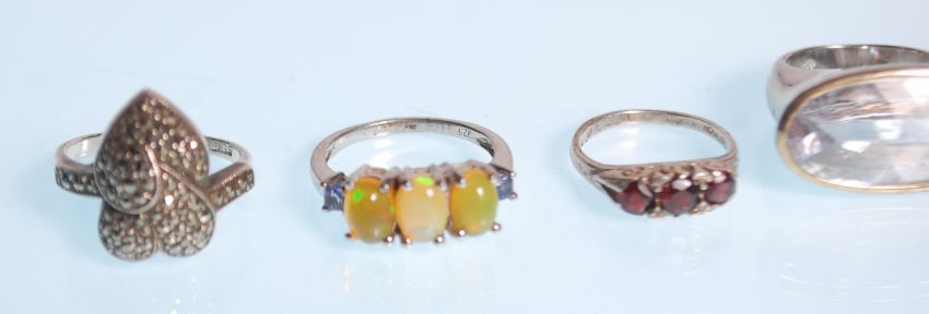 A group of eleven silver rings to include a heart design ring set with marcasites, a claddagh ring set with a blue stone, a ring set with a square cut pink stone, a band ring, a ring set with three black stone cabochons, a knot design ring, a five stone ring set with white stones etc. All marked 925. Weight 55.5g.