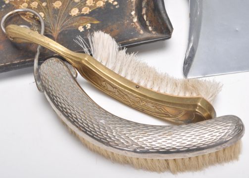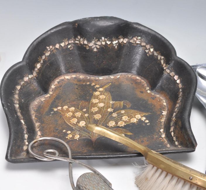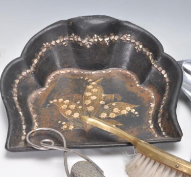 A good mixed collection of crumb trays and brushes dating from the 19th Century to include a chrome Art Nouveau tray and a brass example with matching bruch, ebonised paper mache with mother of pearl decoration tray, J. S & S copper tray etc. Measures 35 cm long.