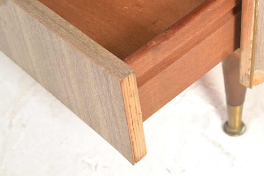A retro 20th Century mirror back melamine cocktail cabinet fitted with sliding glass printed doors to the top over open recess with two drawers below raised on tapering supports.  Measures 106 cm high x 99 cm wide x 34 cm deep.