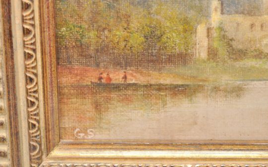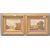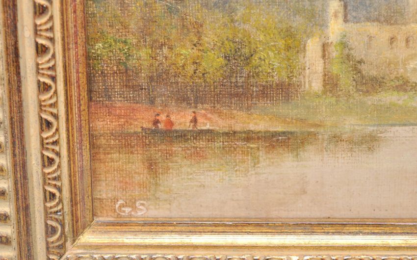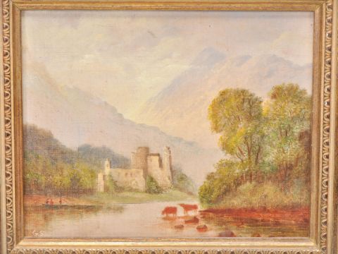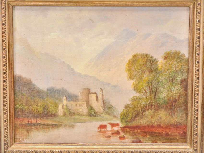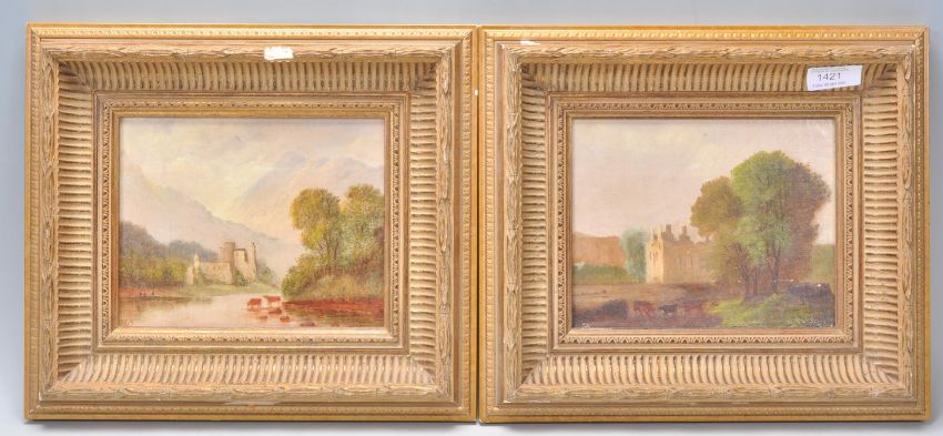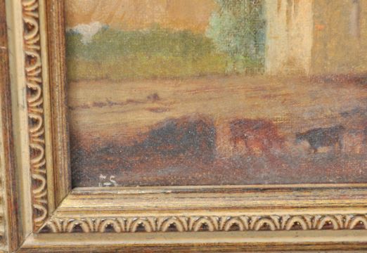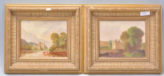 A pair of early 20th Century oil on canvas paintings of small proportions, each depicting landscape scenes with grazing cattle with ruins to the background, likely continental. Set within moulded gilt frames. Both paintings signed with initials GS. Measures: 15cm high x 19cm wide.