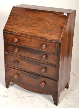 A 19th Century Georgian mahogany bureau of small proportions having one small drawer above three long having knob handles. The fall front opens to reveal a fully appointed interior and red leather writing pad. Raised on bracket feet. Measures 106 x 74 x 44cm.