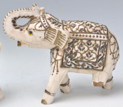 A group of three vintage 20th Century bone Indian elephants having a hand painted and gilt decoration. Tall measures 19cm tall by 25cm wide.
