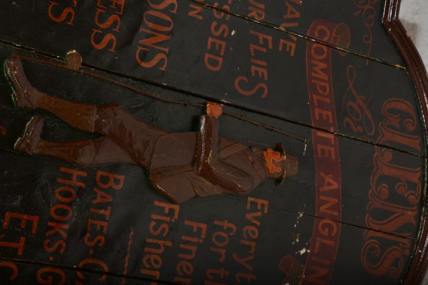 A large wooden hand pained advertising sign for Glens Complete Angling - Everything for the Finer Fisherman. The large sign with dome top and hand painted green, red and orange colourway. Measures 93cm tall by 76cm wide.