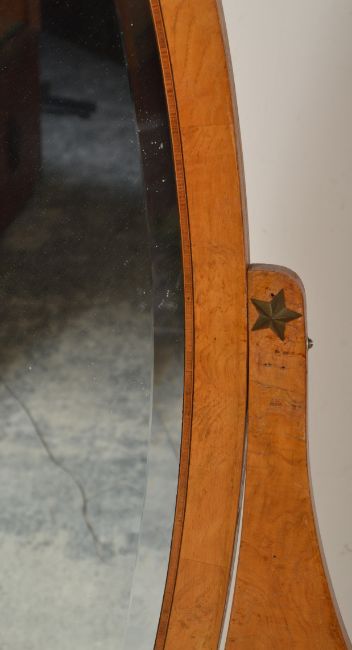 A good 19th century continental burr walnut drop centre dressing table having stunning large oval drop mirror flanked by pedestal banks of drawers with inlaid borders and ring handles. All raised on tapering stub legs. Part of a complete suite, the matching pair of bedside cabinets, double bed and armoire in lot 1301, 1303 & 1304. Measures 179cm tall by 114cm wide and 34cm deep.