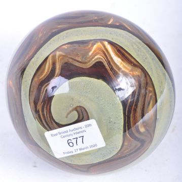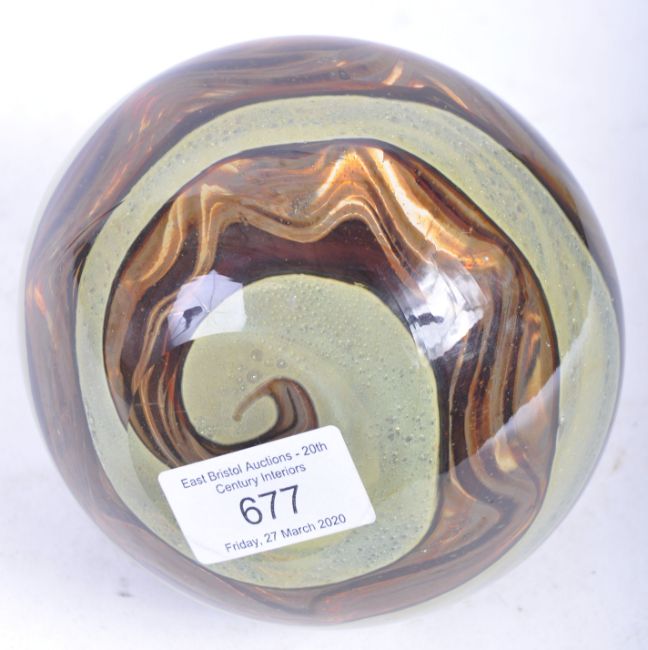 Michael Harris - Mdina - Earthstone - A 1970's Maltese retro vintage studio art glass vase of bulbous and tapered form with streaky brown and gold colourways. Measures; 13cm.