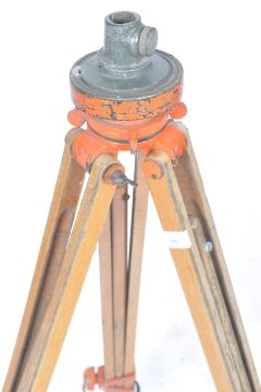A 20th Century retro vintage industrial Theodolite tripod base having cat metal top with beech extending legs and cast metal feet. Easily re purposed for a spot light / theatre lamp. Measures; 104cm.