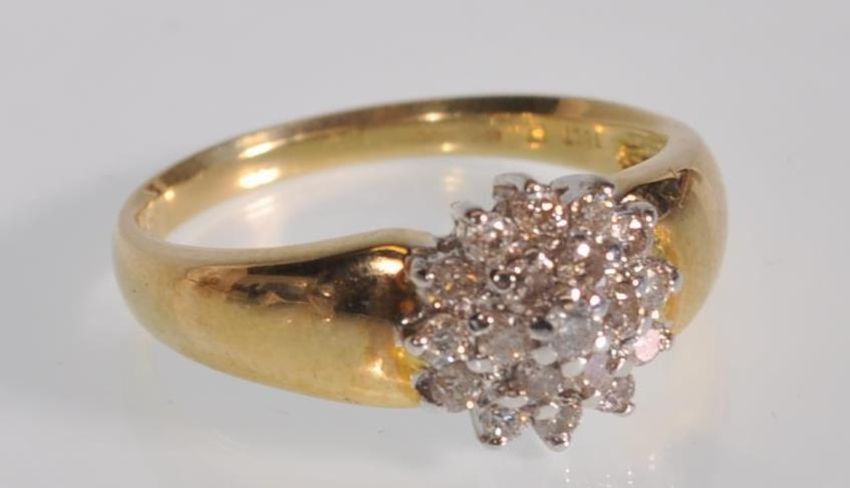 An 18ct yellow gold ladies diamond cluster ring having thick shoulders with approx 0.50pts. Hallmarked 750. Gross weight 4.0g. Ring size R.