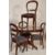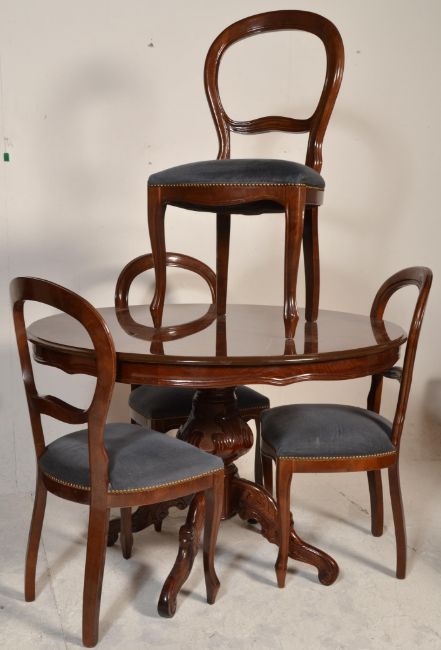 An Italian rococo mahogany and marquetry inlaid pedestal dining chairs raised on bulbous carved column support with splayed legs having a set of 4 matching balloon back dining chairs. Measures 82 cm high x 116 cm diameter.