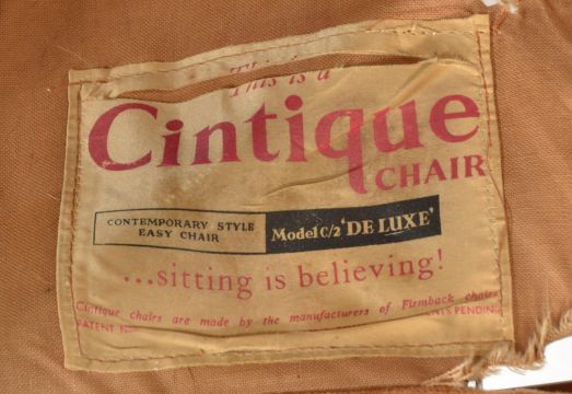 A pair of mid century teak wood Cintique armchairs. Each raised on show wood a-frames with upholstered seats and back rests flanked by elbow rests. Cintique marks to underside of seat cushion.