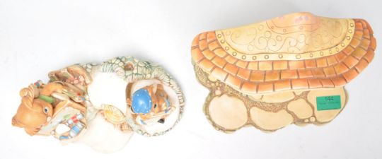 A vintage 20th Century Pendelfin display stand 'Wishing Well' together with another and two Pendelfin rabbit figures. Biggest display measures 22cm tall by 23cm wide.