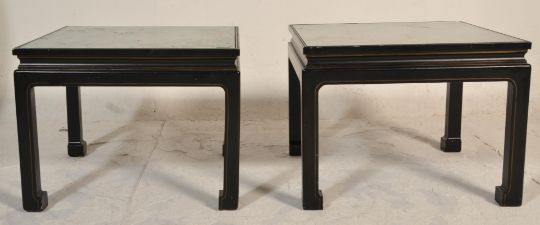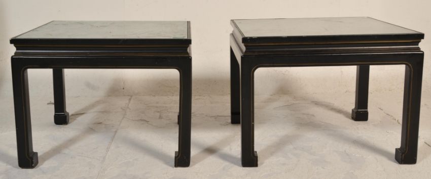A pair of Chinese republic style black lacquered occasional / side / bedside table being raised on squared legs with inset glass tops having gilded line borders.