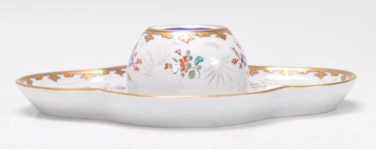 A good 19th Century Dresden inkwell set onto a oval base having ornate hand painted floral sprays and gilt work, including a fitted blue glass ink pot to the interior. Measures 5cm tall by 18cm wide.