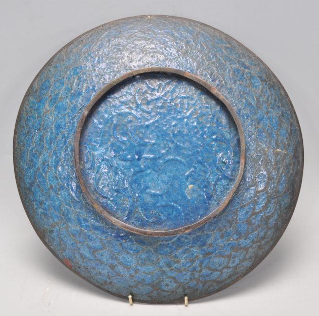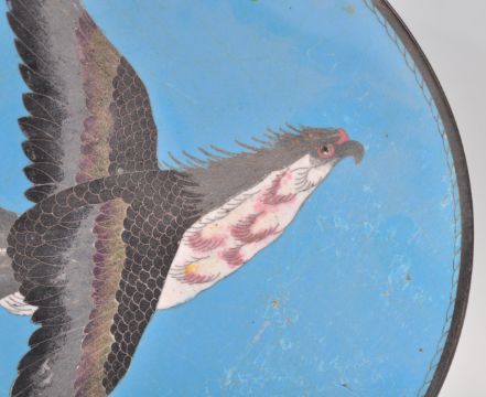 An unusual  believed 19th century Chinese enamel charger plater being heavily enamelled with blue ground and scene of eagle souring. Raised foot to underside.