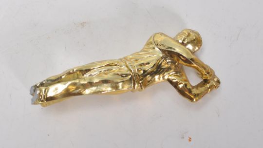 A retro 20th Century ice bucket in the form of a golf ball having a small metal golf figure atop and glass lined interior. Measures 29 cm tall.