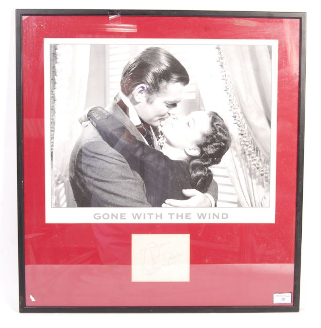 Clark Gable (1901-1960) - American Actor - a rare original autographed album page, mounted beneath a large publicity photograph from ' Gone With The Wind ' depicting the actor in an embrace with Vivien Leigh, a still from the film. The autograph in blue ink, dedicated, 'To Jean'. Along with a copy of 'Gone With The Wind - The Film Story' book. Framed and glazed to a total size of 63cm x 60cm. From the private collection of Peter Wyngarde. Wyngarde worked with Leigh on several occasions, and admitted to having a love affair with the actress.