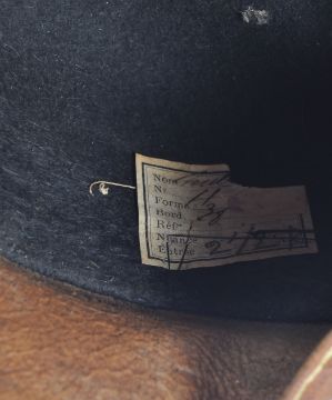Unknown Production - an original vintage prop / costume quadcorn hat. Black, with a matching black band. No maker. Label to interior partially legible. Generally very good condition, but a little dusty from storage. Likely used in a production from Peter Wyngarde's varied theatre, television and film career.