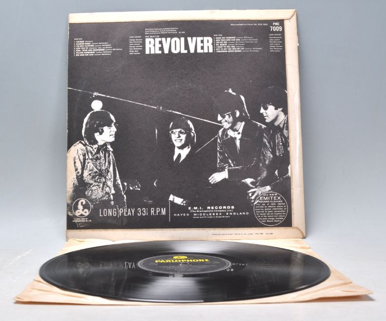A vinyl long play LP record album by The Beatles – Revolver – Original Parlophone 1st U.K. Press – PMC 7009 Mono. Vinyl Condition G. Sleeve Condition G. Matrix number to side two EXE 606-1.